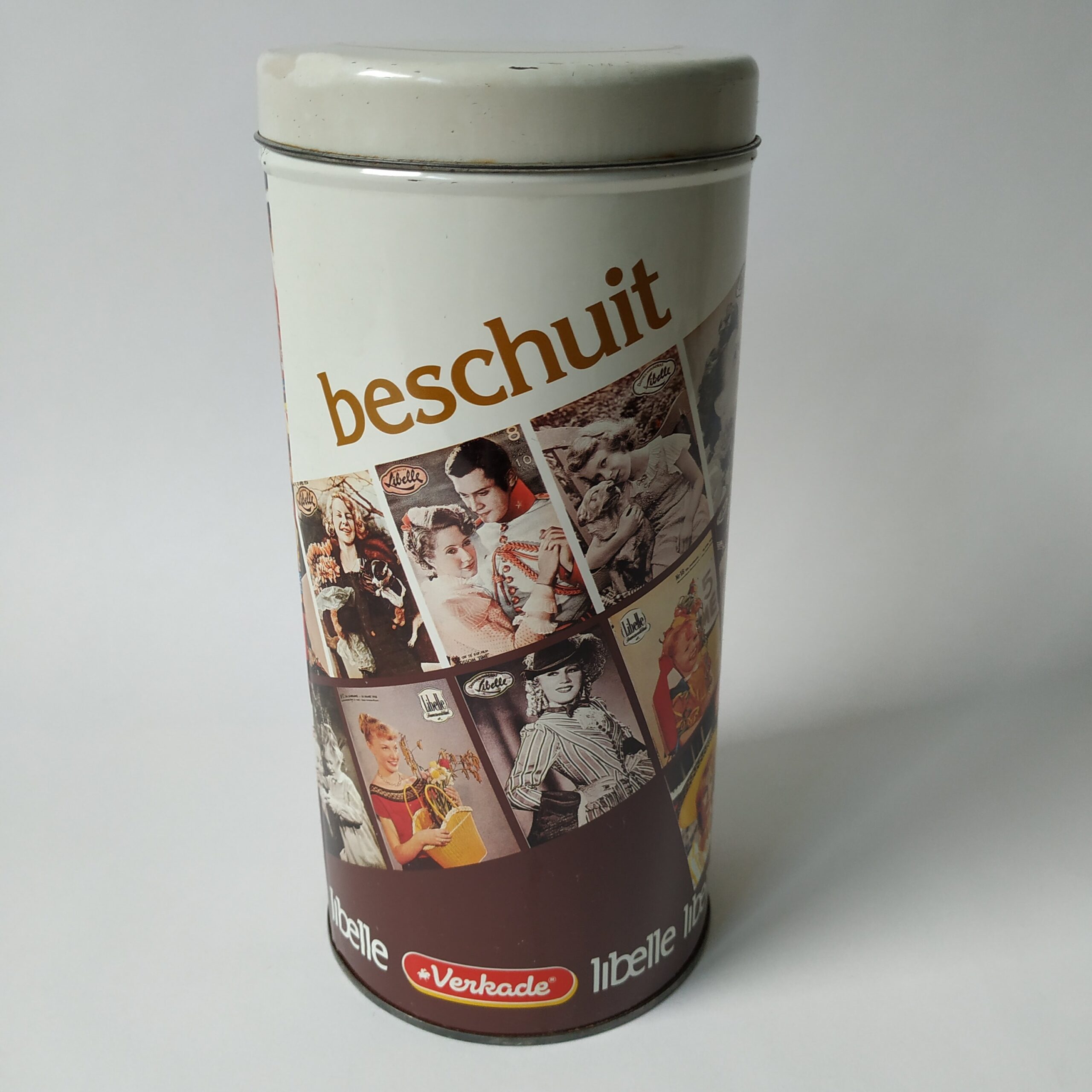 Vintage beschuitbus van Verkade met voorpagina’s uit de jaren 50 en 60 van het blad Libelle. Het beschuitblik is een jubileumuitgave, jaar 1984-1985. Hoogte: 23 cm. Diameter: 11 cm. In goede vintage staat, heeft gebruikssporen.