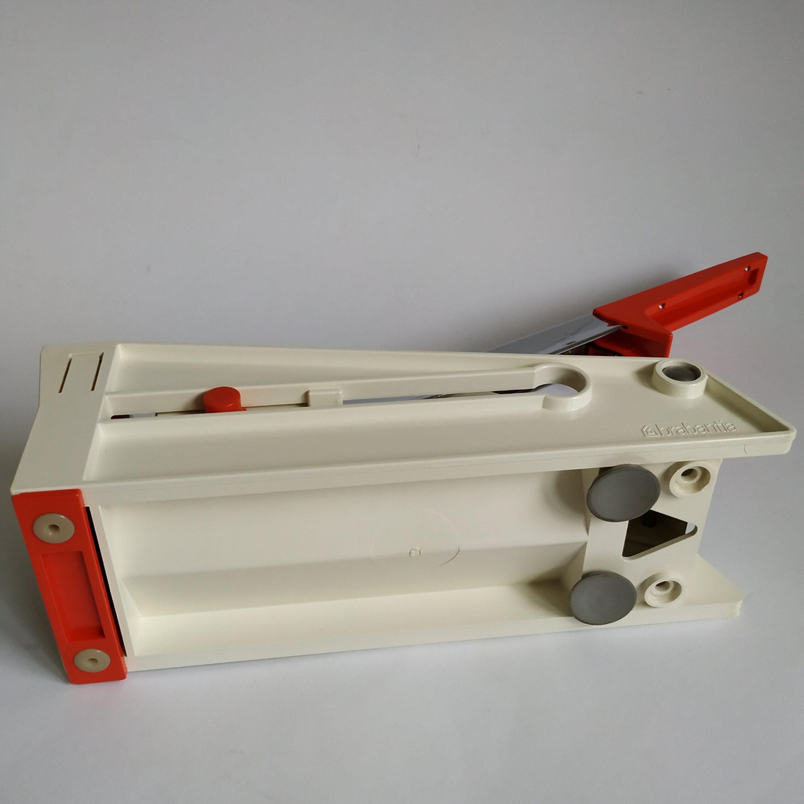 Vintage kunststof frietsnijder / patatsnijder van Brabantia. Het heeft een zilverkleurig metalen greep. Lengte: 24 cm , incl. de greep is het 34 cm. Breed: 8,5 cm Kleur: wit en oranje. In goede vintage staat.