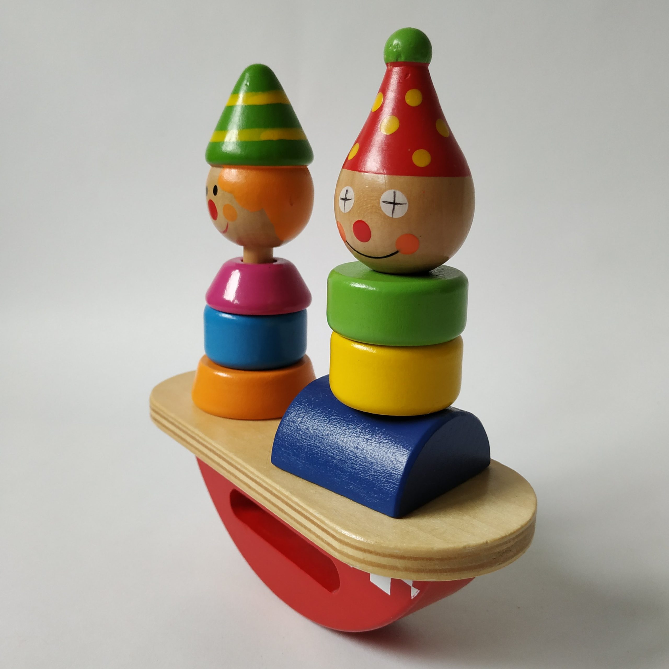 Kleurrijke balansboot van hout met stapelfiguren.