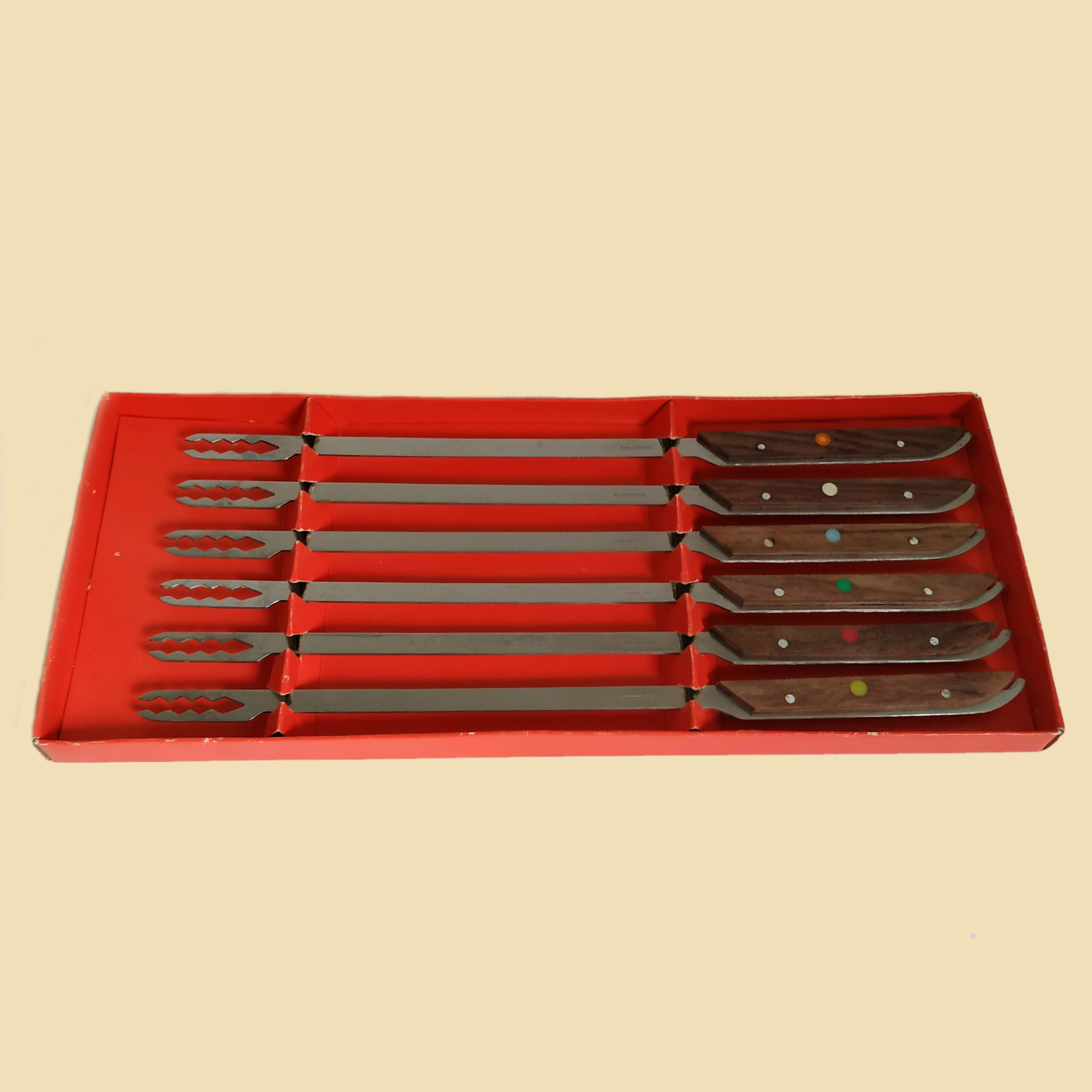 Vintage fondue vorken – 6 stuks. Handvat: hout met kleuraanduiding. In goede vintage staat.