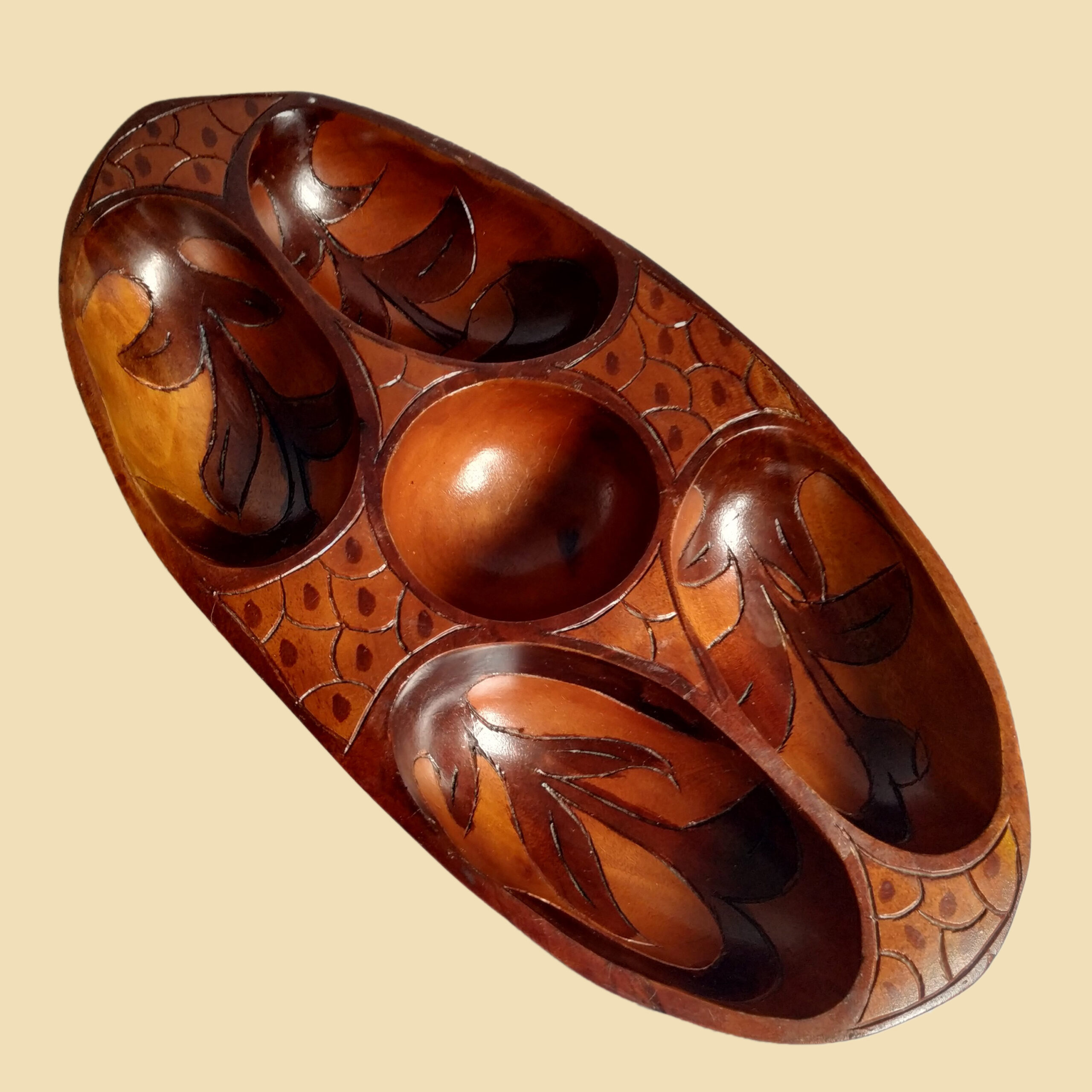 Vintage houten schaal met vakken en snijwerk. De schaal heeft 5 vakken met aan bovenzijde en onderzijde snijwerk. Afmeting: 32,5 x 16,5 x 5 cm. In goede vintage staat.