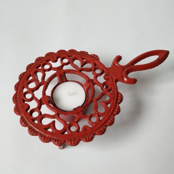 Theelichthouder/rechaud van gietijzer met handvat in de kleur rood.