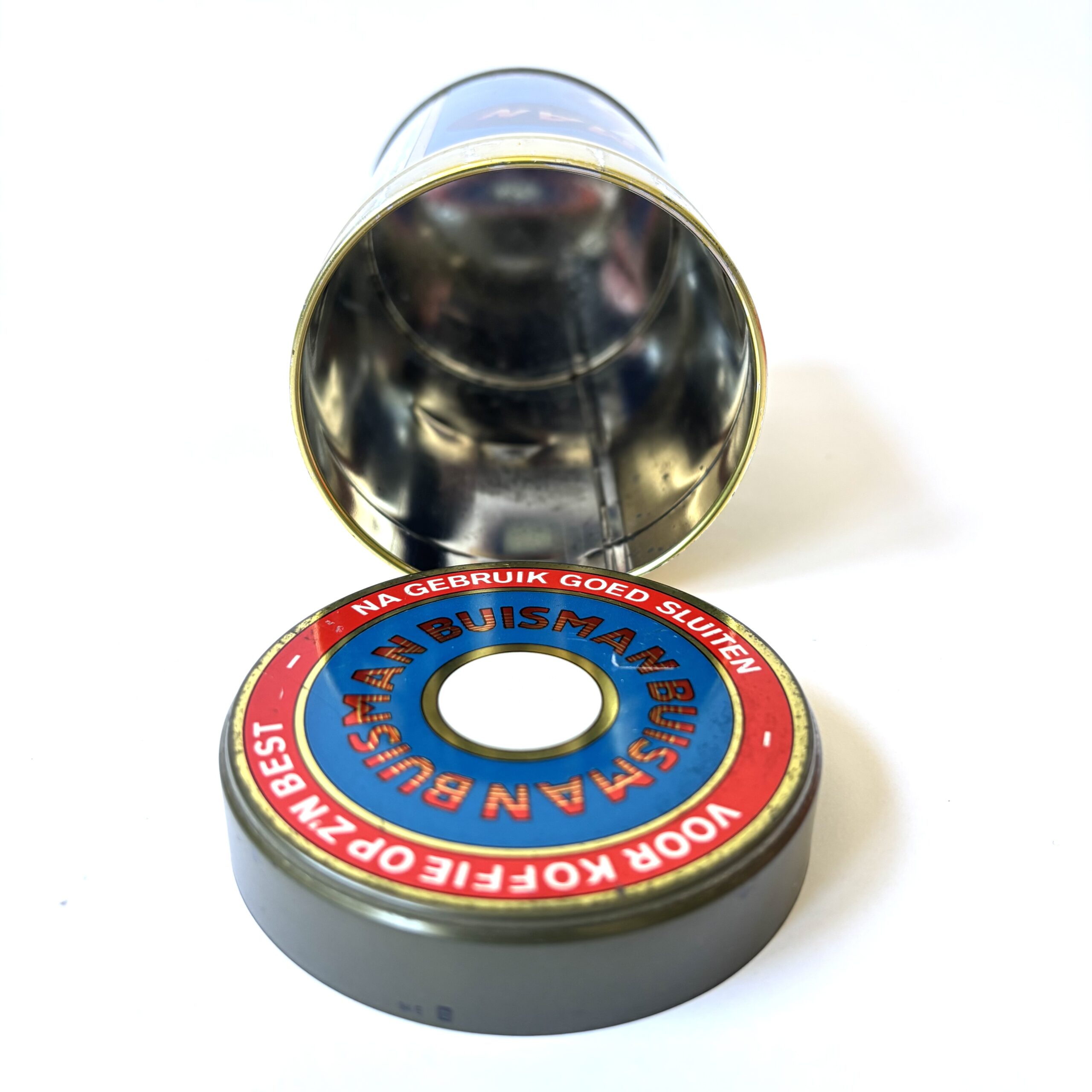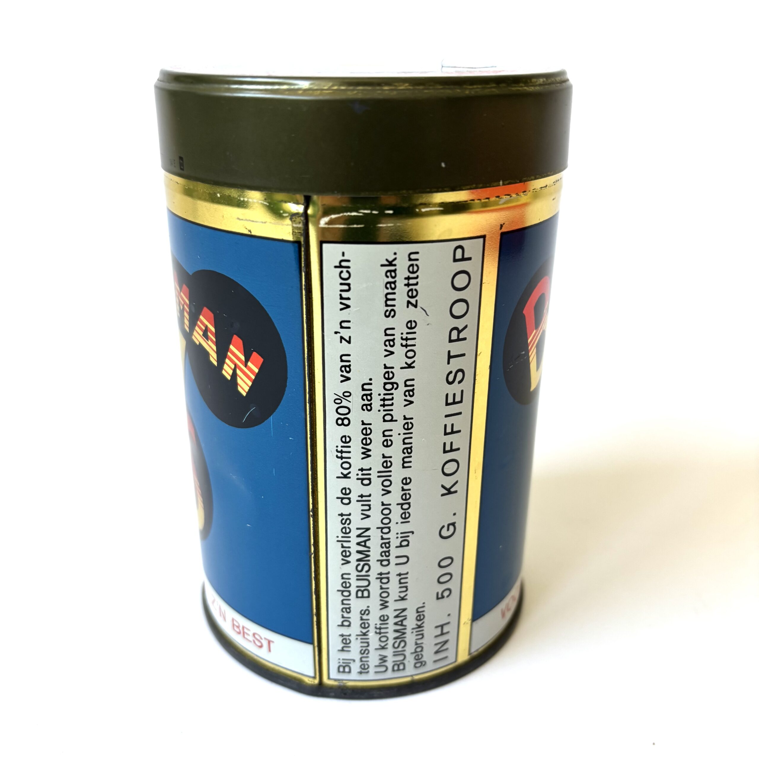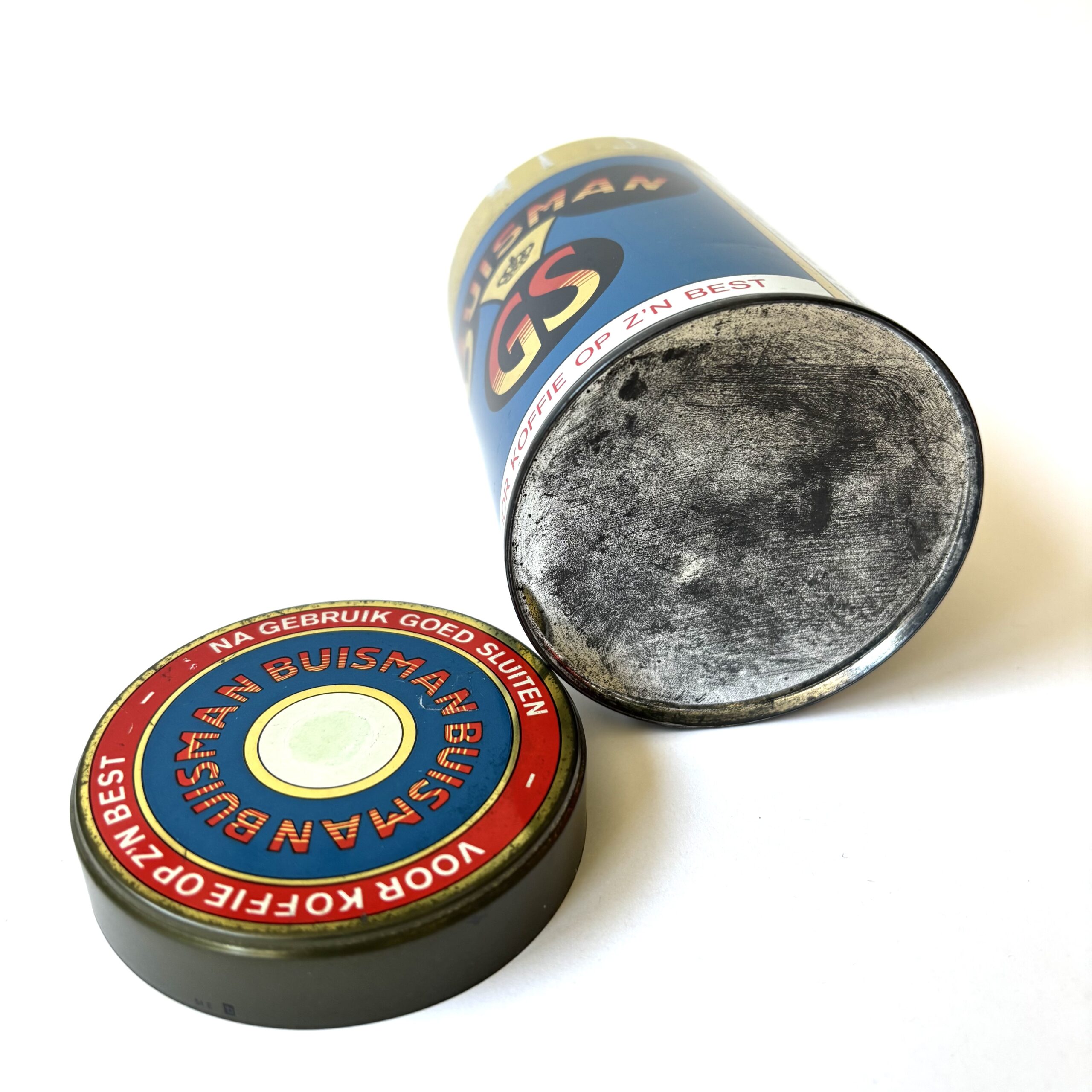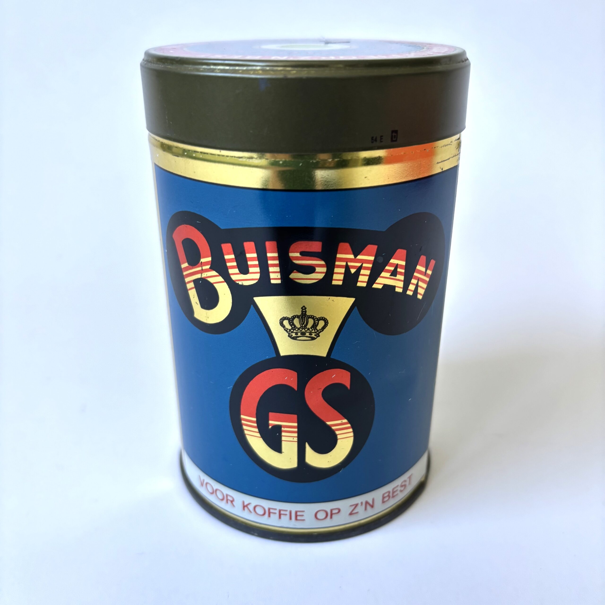 Vintage blik Buisman GS, voor koffie op z’n best. Koninklijke Buisman, een bedrijf dat al sinds 1867 bestaat en het predicaat Koninklijk voert sinds 1951. Het blik bevatte oorspronkelijk Buisman aroma, een gebrande suikerpoeder.