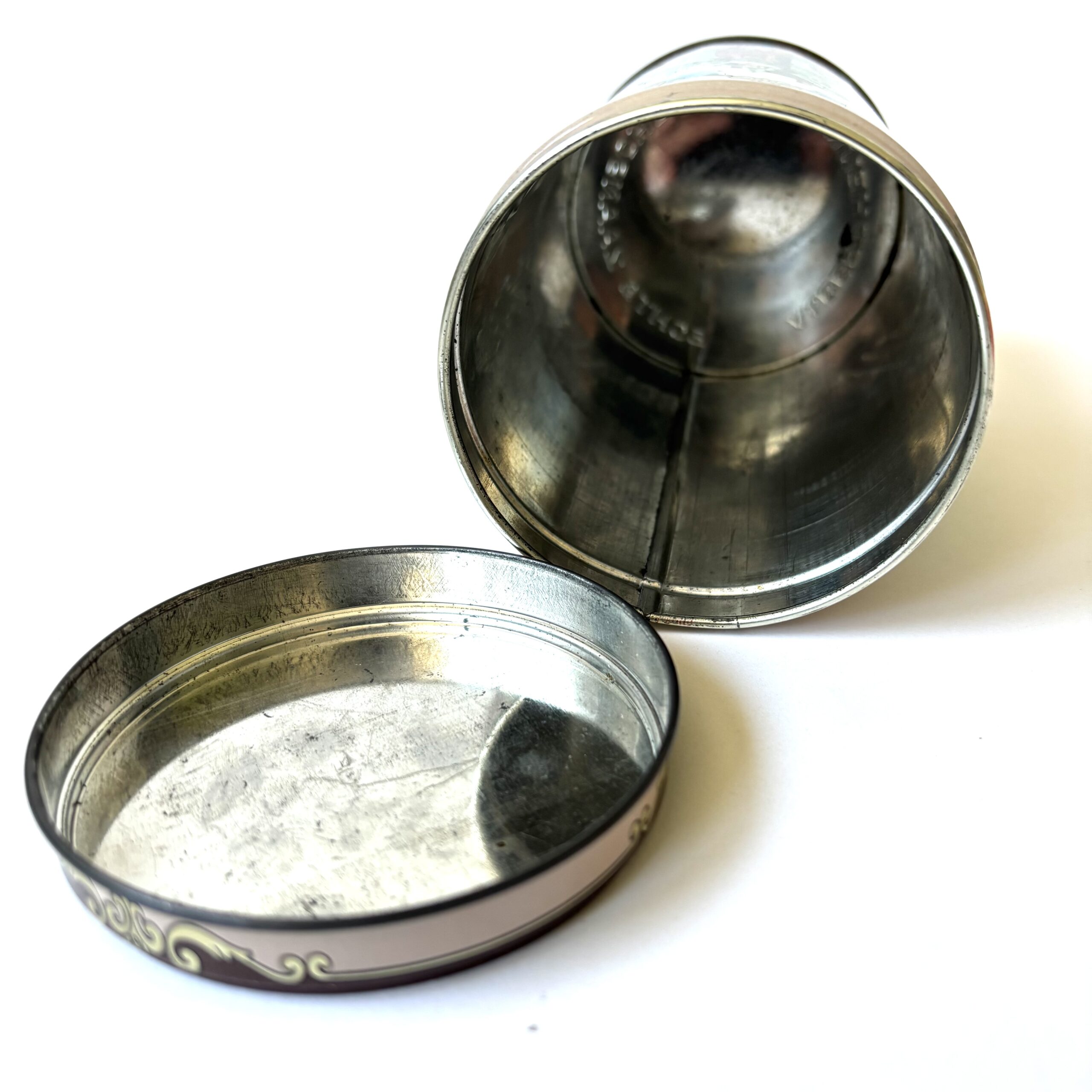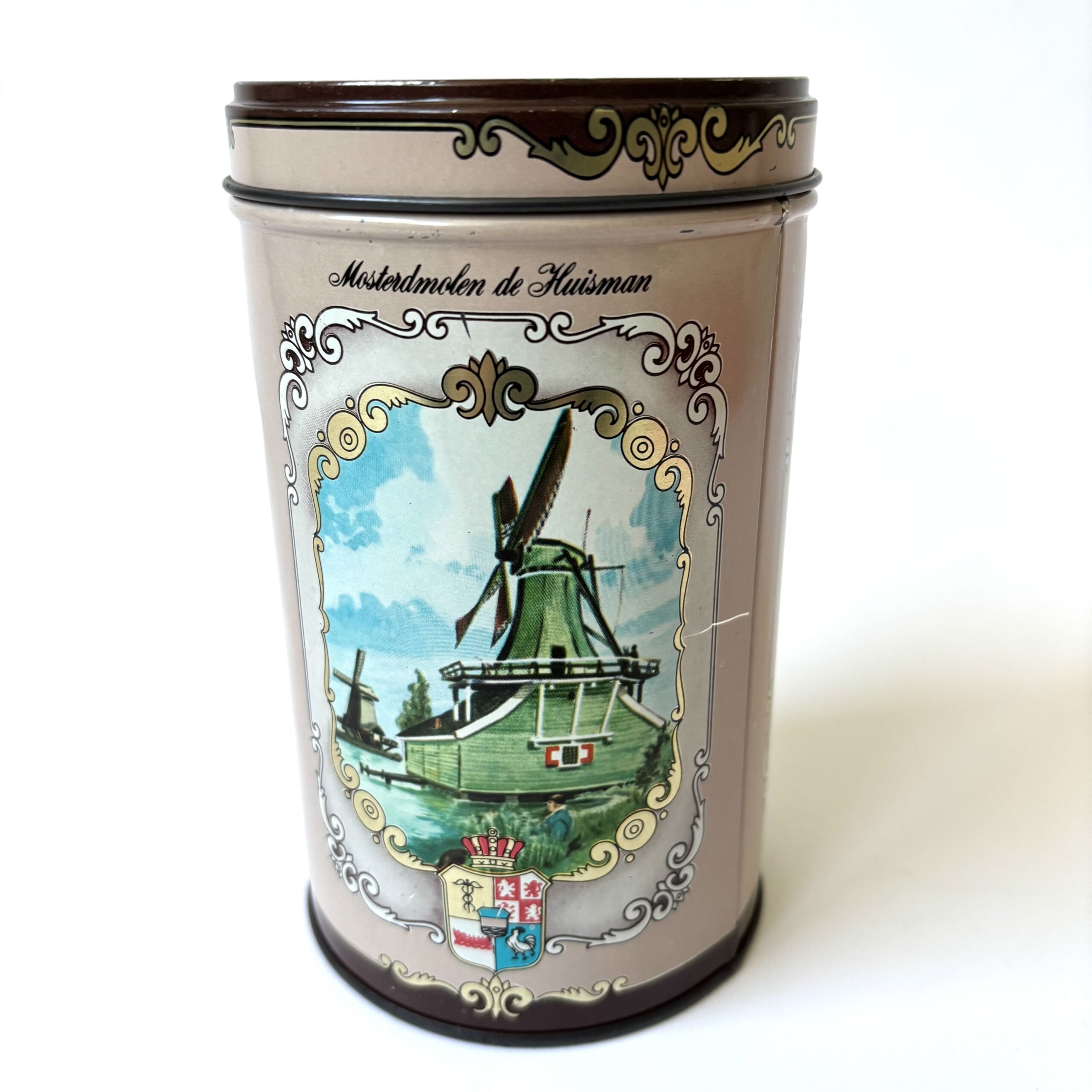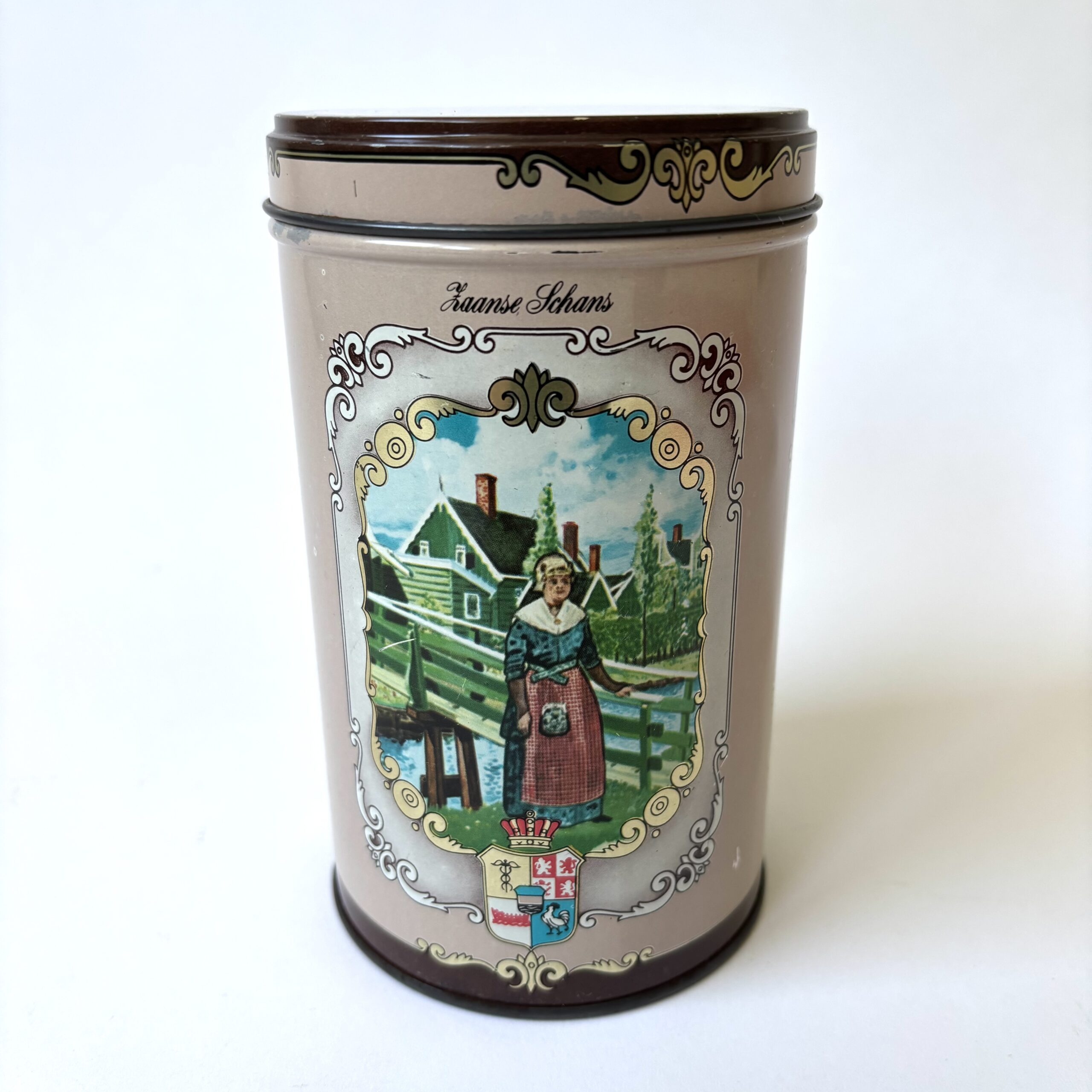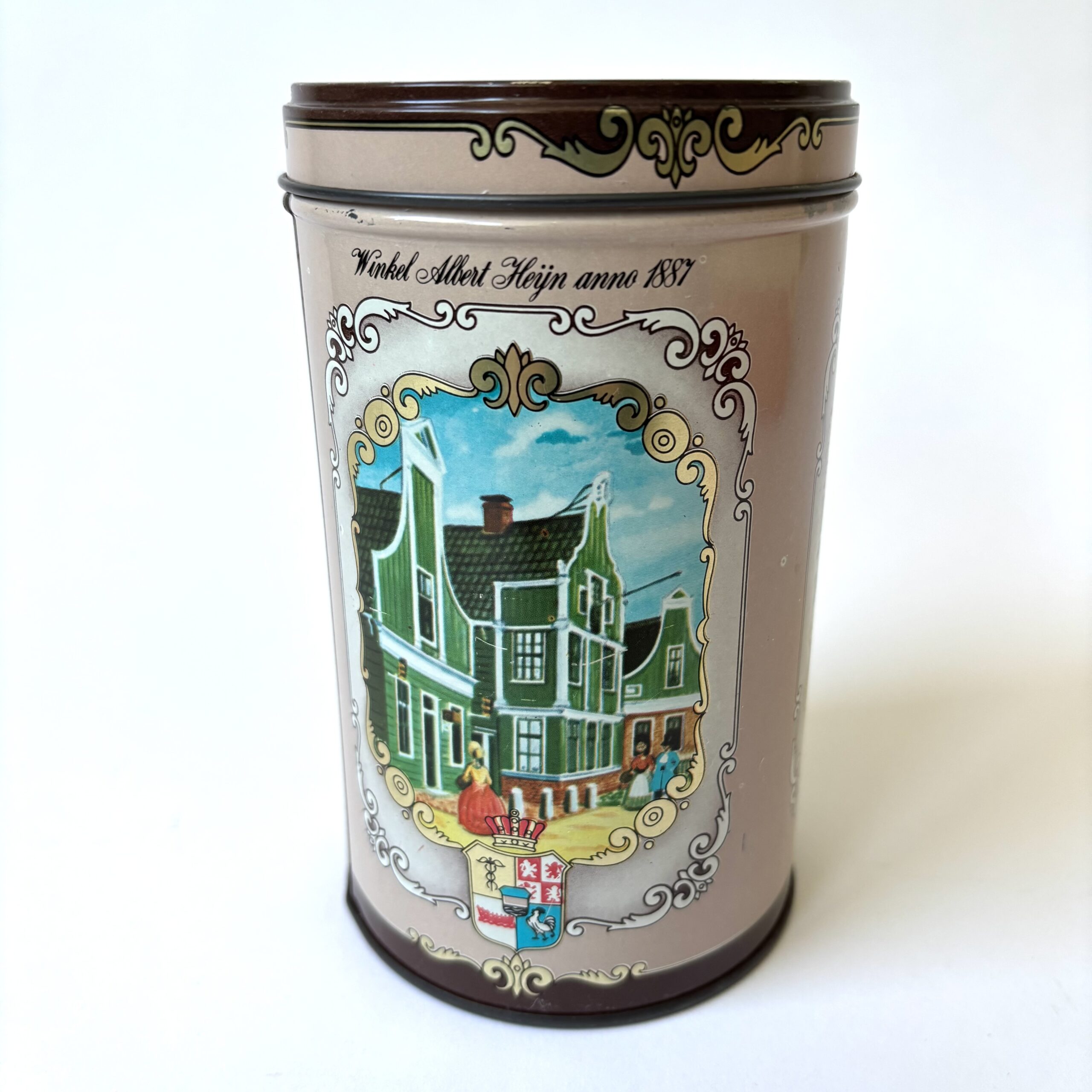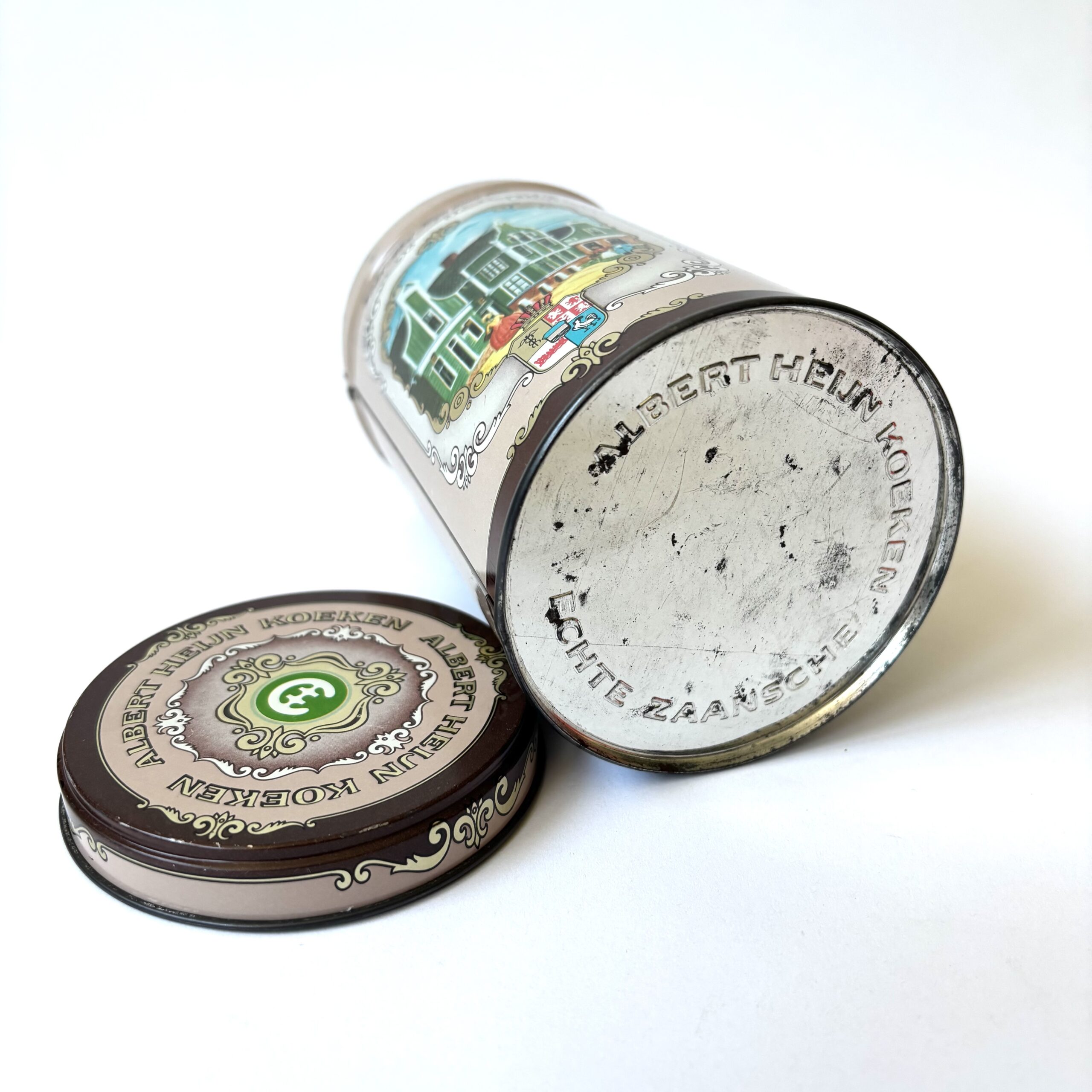 Vintage blik koeken van Albert Heijn. Met afbeeldingen van de Zaanse Schans, Mosterdmolen de Huisman en Winkel Albert Heijn anno 1887. Hoogte: 14,5 cm. Diameter: 9 cm. In goede vintage staat.