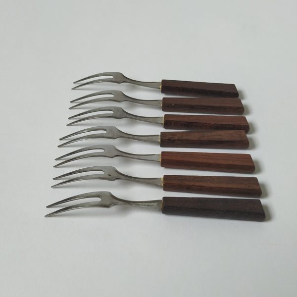 Vintage houten/stainless steel cocktailvorkjes, – 7 stuks.
