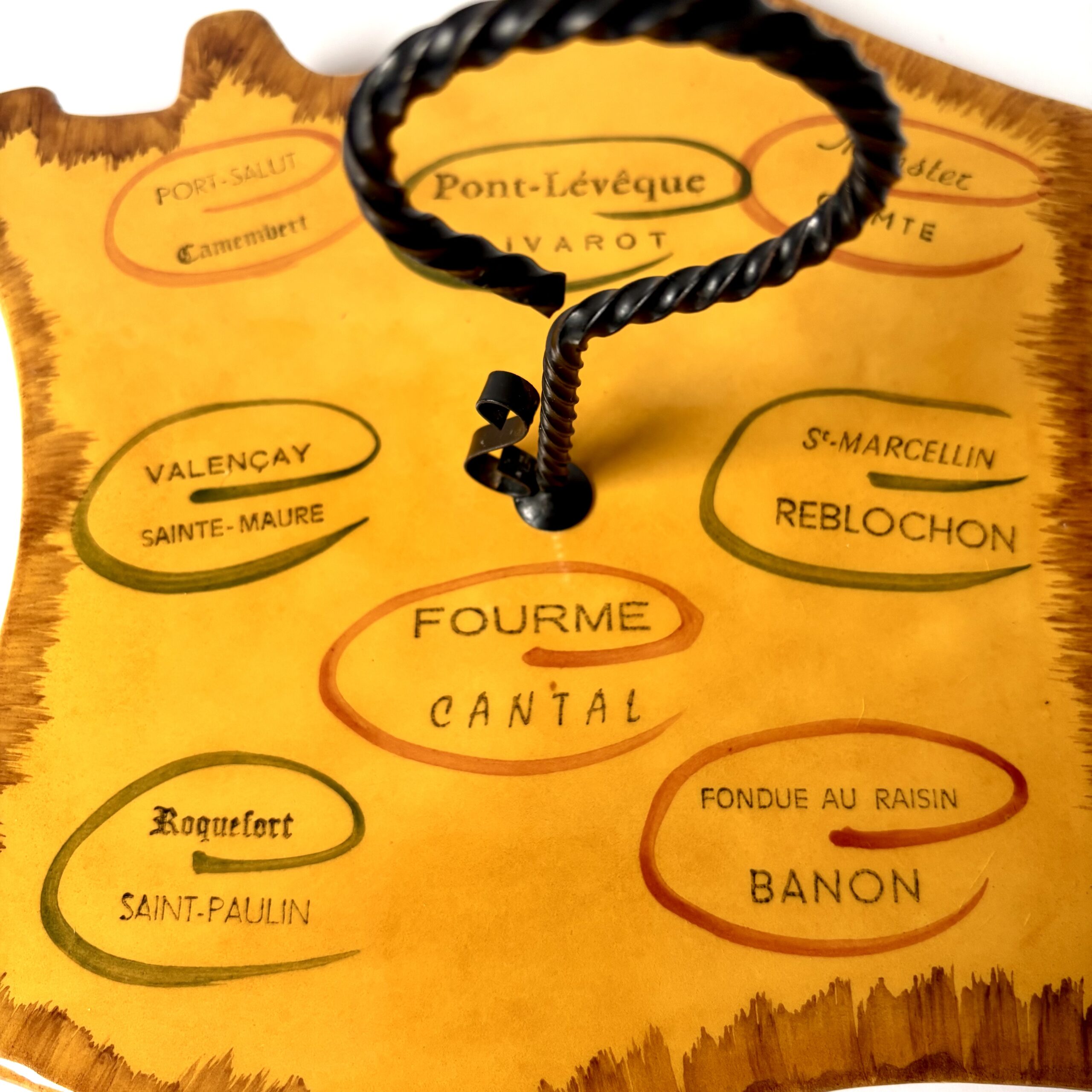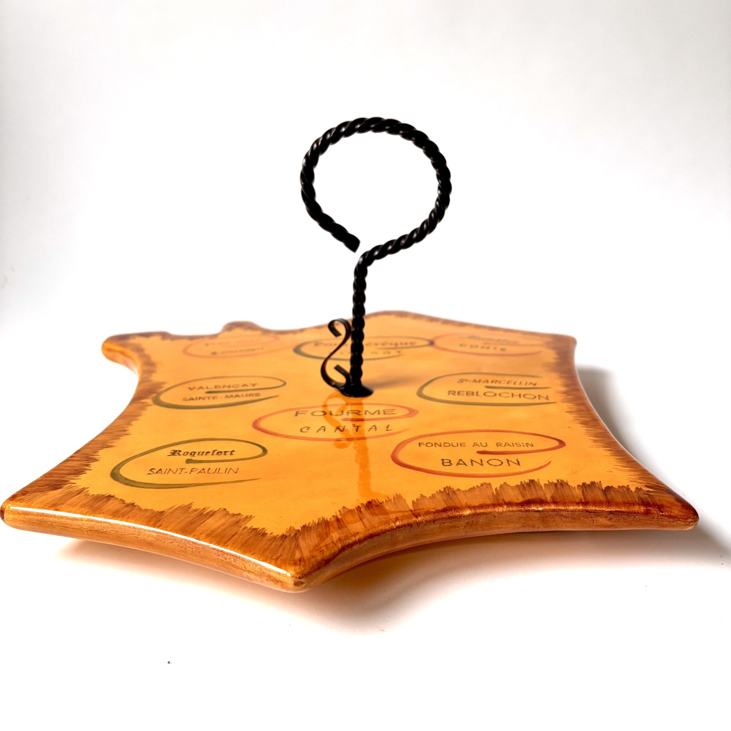 Vintage keramische kaas/serveerschaal van Vallauris France uit de jaren 60. De schaal is gevormd als de kaart van Frankrijk en toont de beroemde Franse kaasregio’s, zoals Pont-L’Eveque en Reblochon.