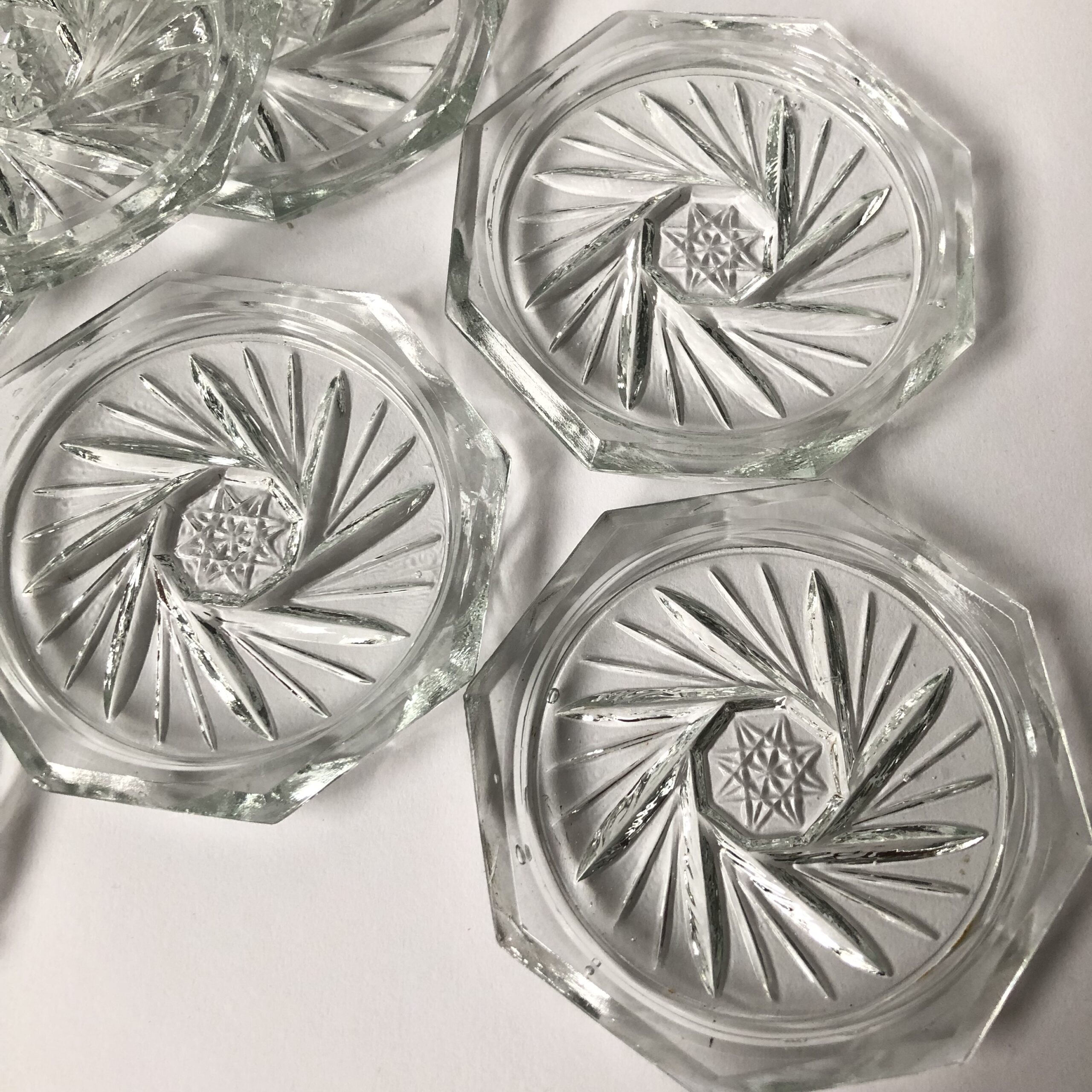 Vintage zwart metalen rekje met 12 glazen onderzetters.