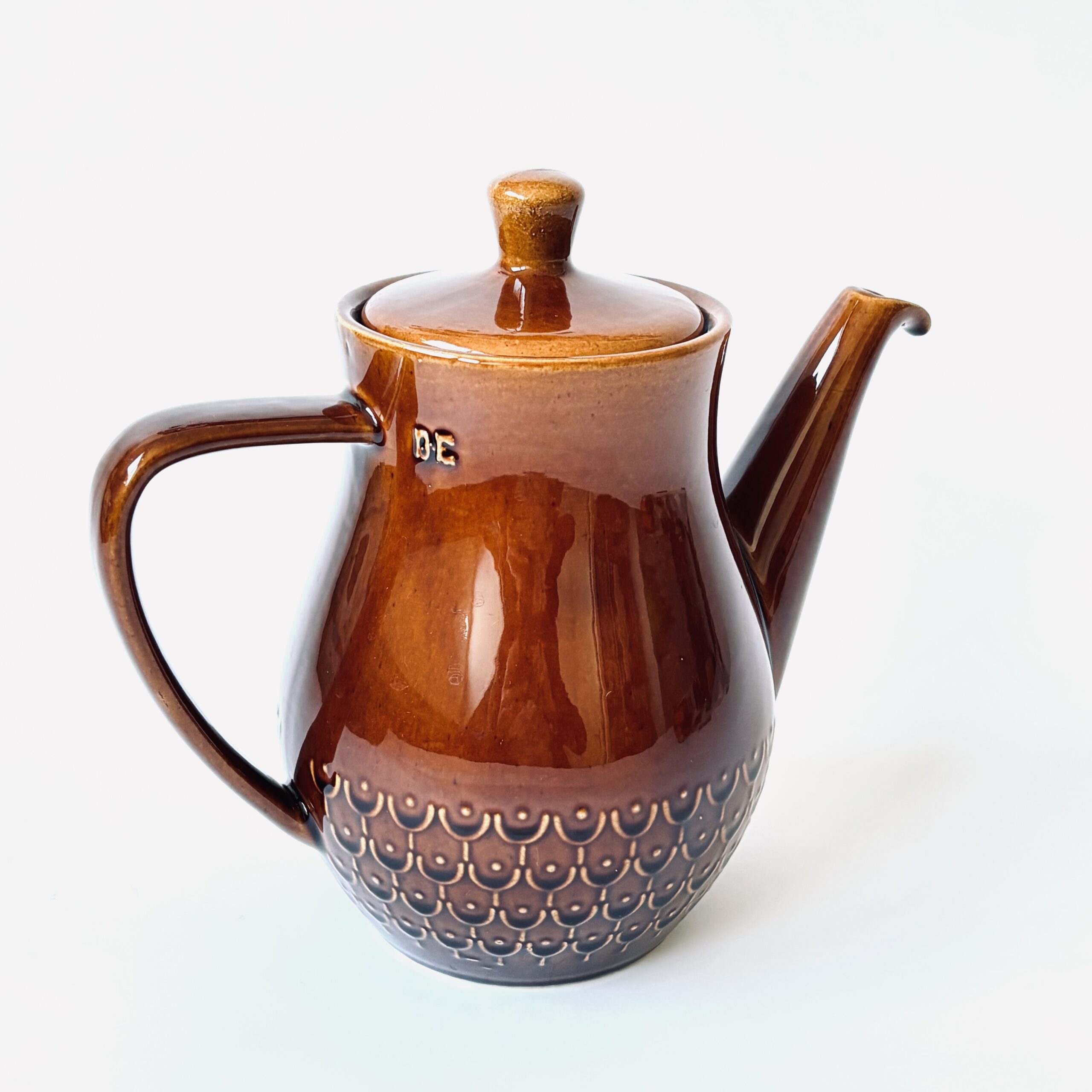 Vintage Douwe Egberts (DE) glanzend bruine keramische koffiekan / theekan met een schubben- of reliëfpatroon aan de onderzijde
