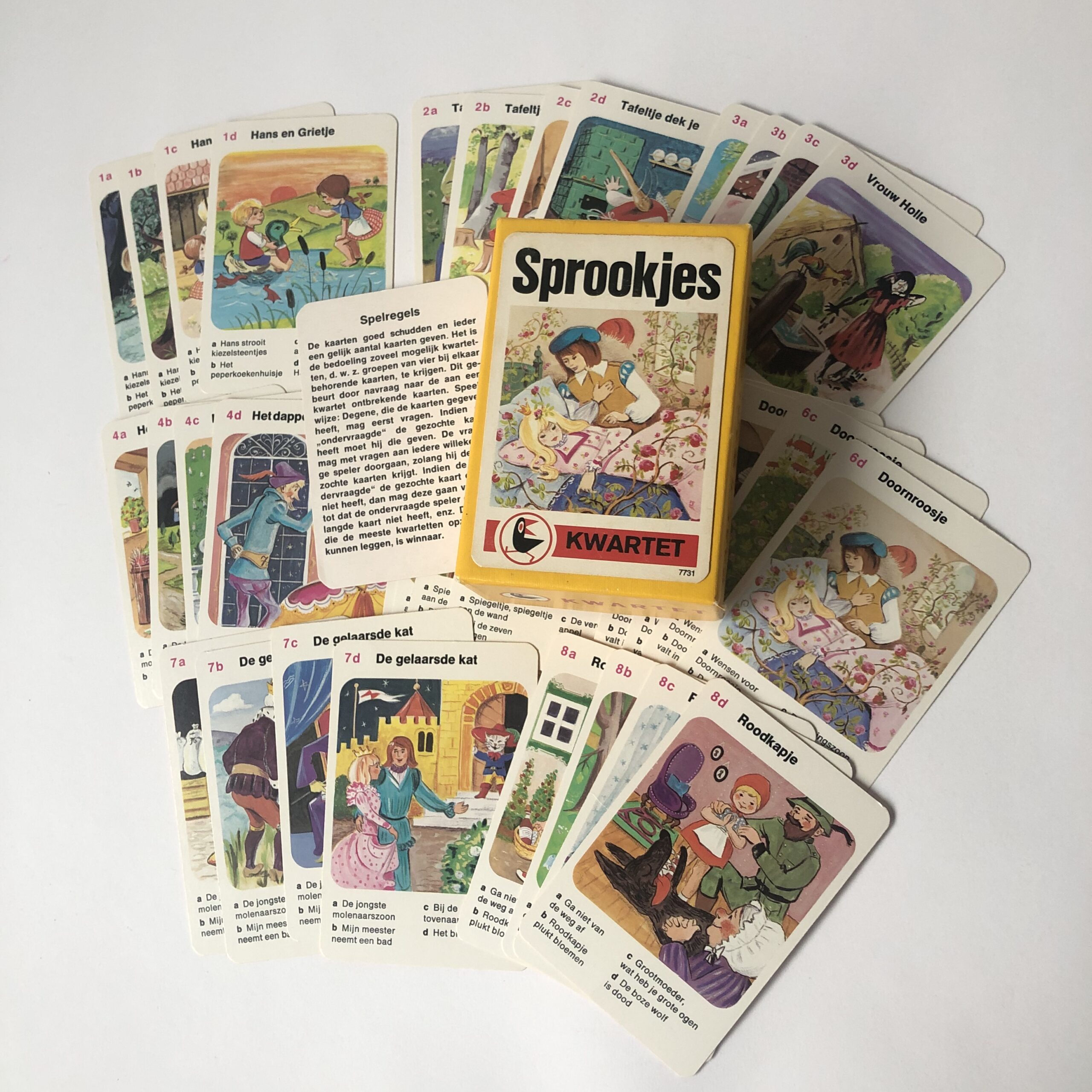 Dit sprookjes kwartet bevat kaarten uit de sprookjes van Hans en Grietje, Tafeltje dek je, Vrouw Holle, Het dappere kleermakertje, Sneeuwwitje, Doornroosje, De gelaarsde kat en Roodkapje.