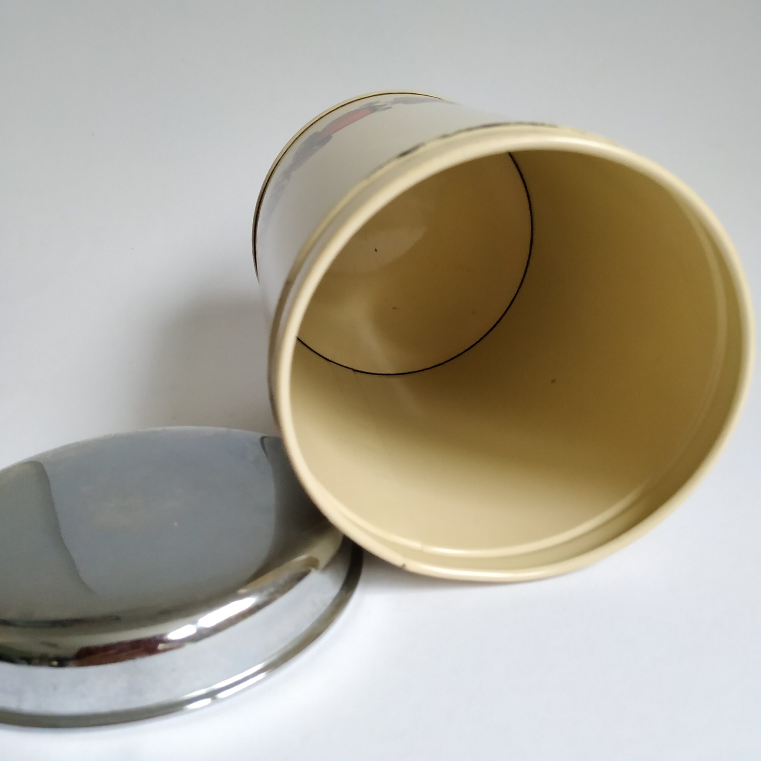 Het blik heeft een chromen deksel met een gedecoreerde rand.