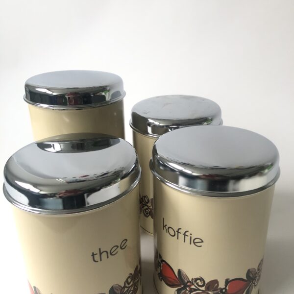 Deze mooie set bestaat uit vier blikken, koffie, thee, suiker en beschuit (met ophaal functie)
