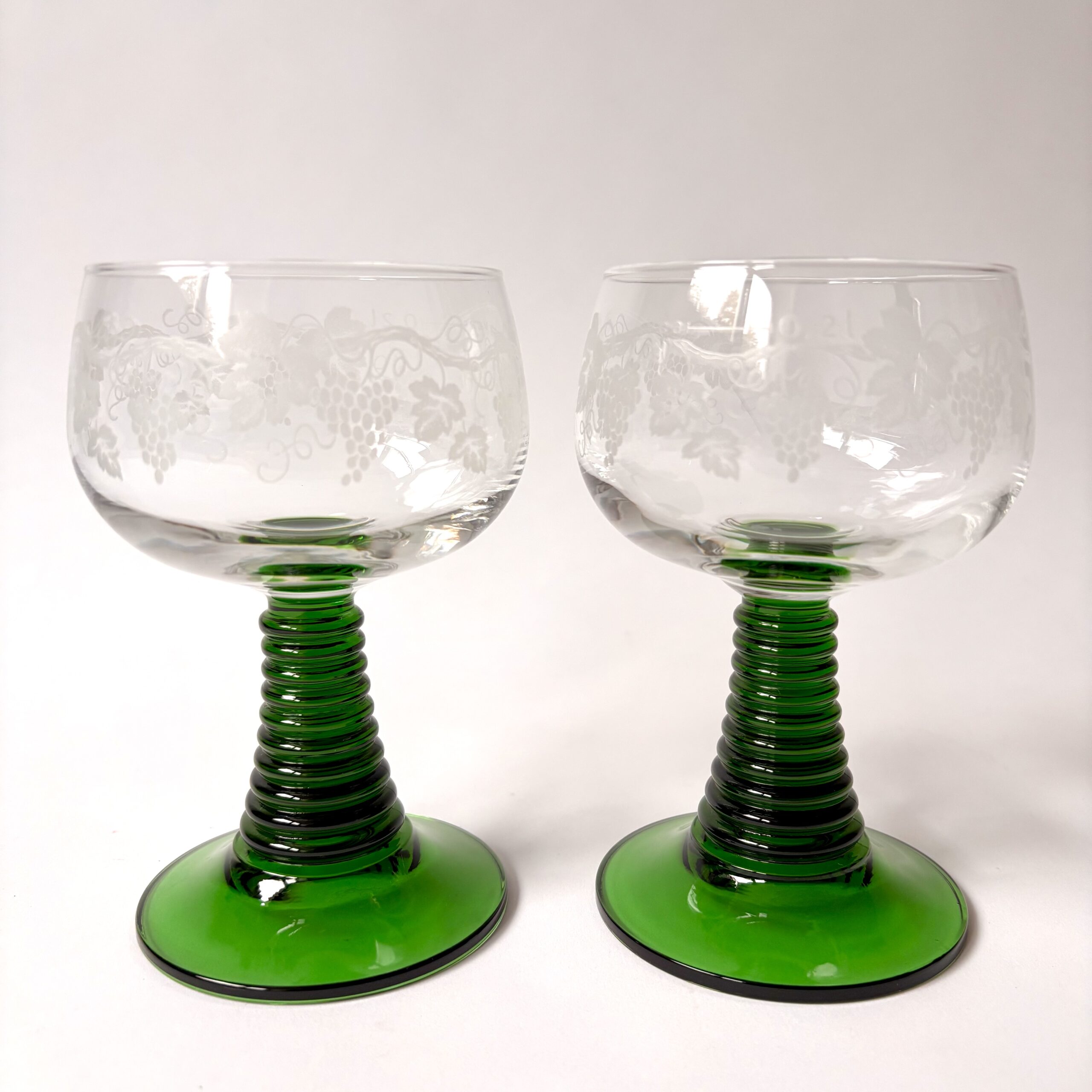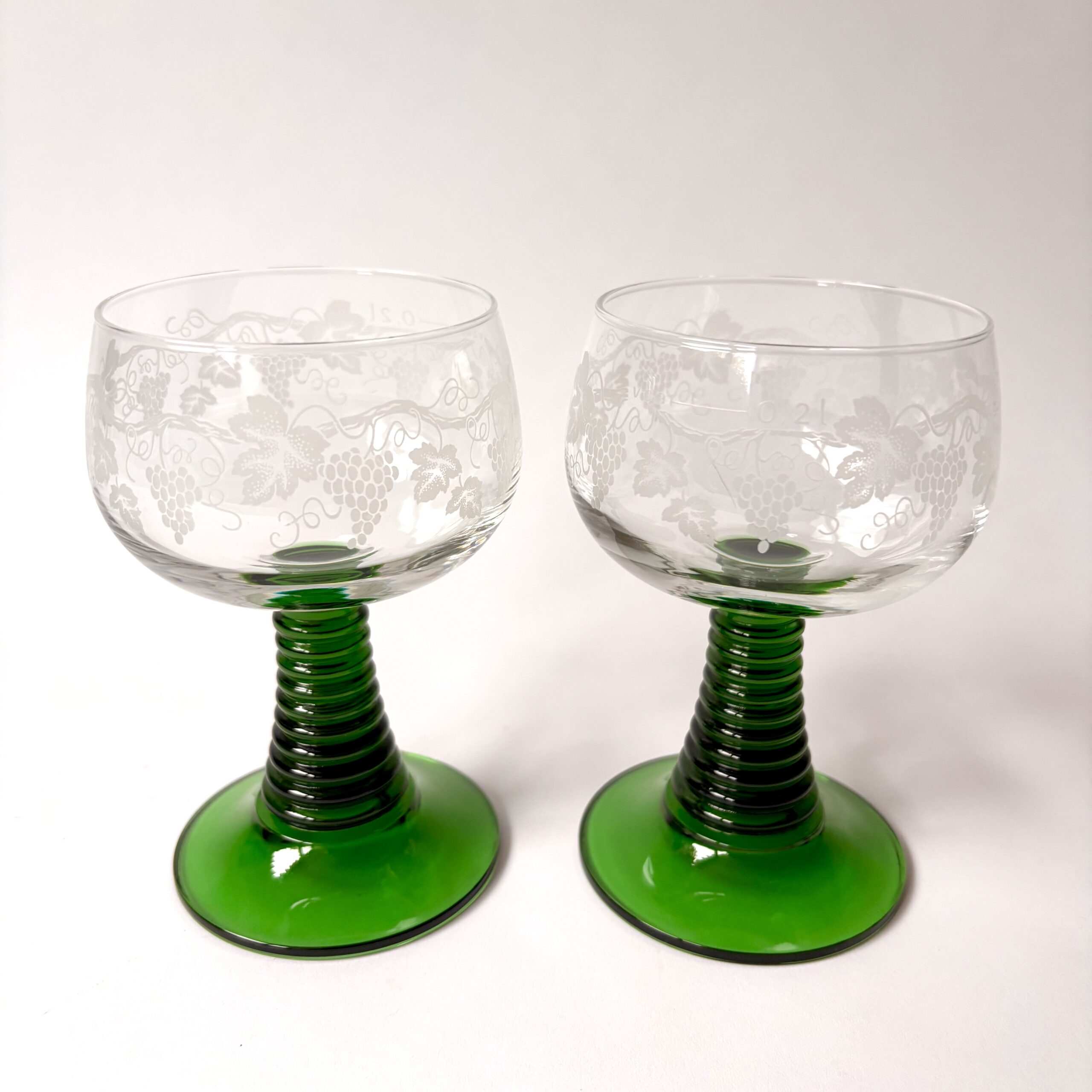 Vintage wijnglazen / moezelglazen France met groene voet, – 2 stuks.