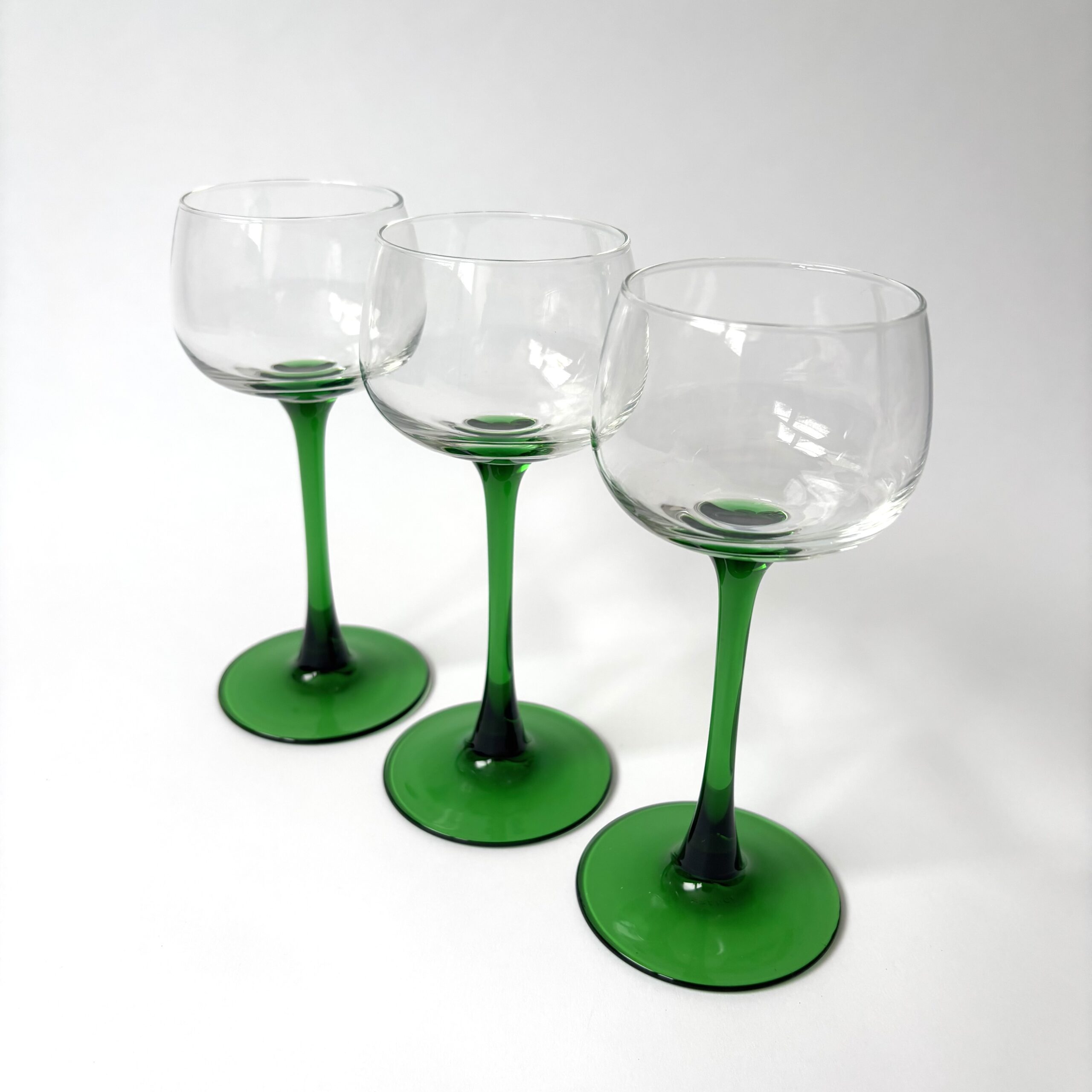 Vintage wijnglazen / moezelglazen Luminarc France met hoge groene voet,- 3 stuks.